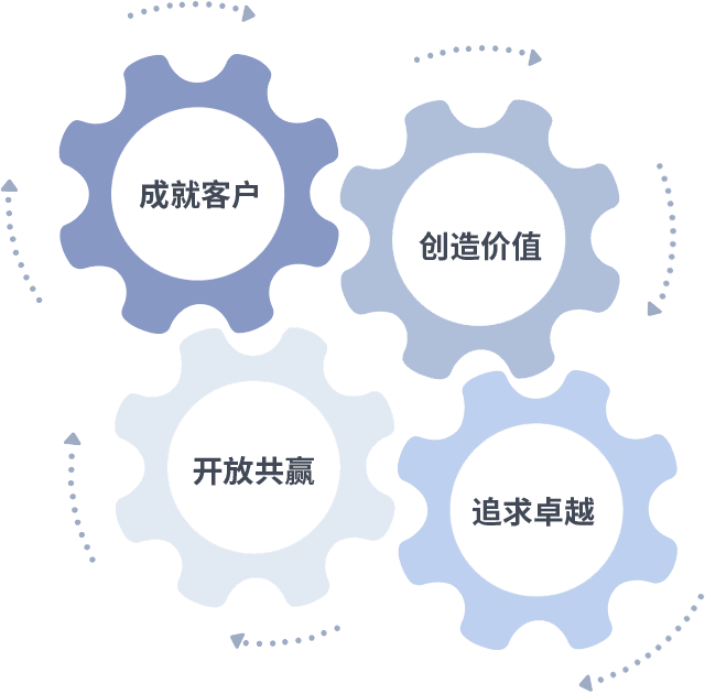 成就客户是一切决策的出发点,,创造价值是衡量所有工作的标准,,,,追求卓越是我们做事做人的态度,,,,开放共赢是我们的格局也是最终的结果。。。价值观的齿轮环环相扣,,推动着组织里的每个人不断向前。。
